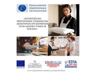 Η Πανελλήνια Ομοσπονδία Ξενοδόχων (ΠΟΞ) ως Δικαιούχος της Πράξης «Κατάρτιση και Πιστοποίηση Γνώσεων και Δεξιοτήτων Εργαζομένων στον Ιδιωτικό Τομέα (Β’ ΚΥΚΛΟΣ)», με MIS 5035121 που έχει ενταχθεί στο Ε.Π. Ανταγωνιστικότητα, Επιχειρηματικότητα και Καινοτομία 2014-2020 και συγχρηματοδοτείται από το Ευρωπαϊκό Κοινωνικό Ταμείο της Ευρωπαϊκής Ένωσης και εθνικούς πόρους, προσκαλεί  εργαζόμενους σε επιχειρήσεις του ιδιωτικού τομέα (ανεξαρτήτως κλάδου ή τομέα απασχόλησης) να  συμμετάσχουν σε επιδοτούμενες δράσεις κατάρτισης και πιστοποίησης της παραπάνω Πράξης, και ειδικότερα στα παρακάτω εκπαιδευτικά προγράμματα: